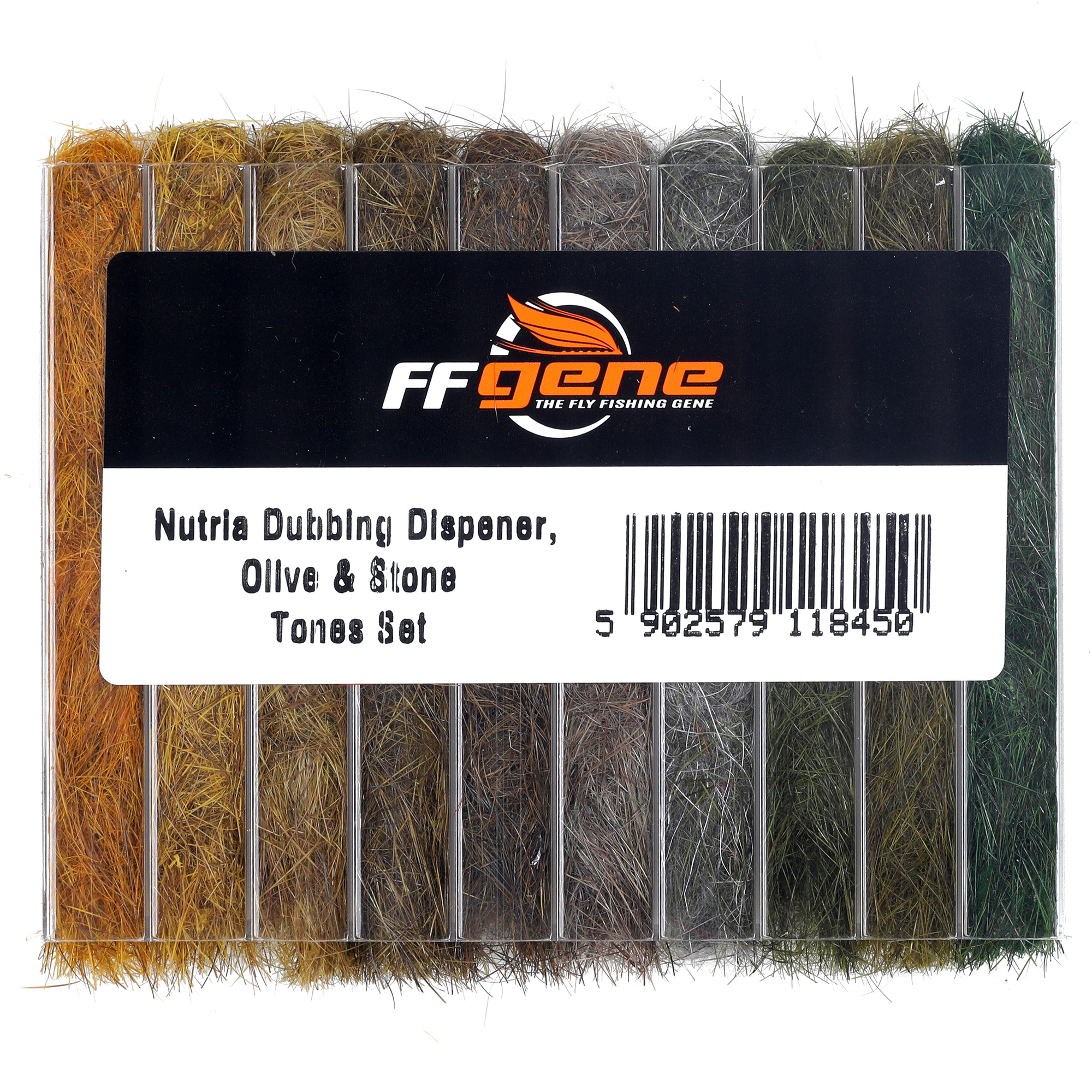 FFGene Nutria Dubbing Dispenser to zestaw naturalnych dubbingów z sierści nutrii, uporządkowanych w przezroczystej kasecie z tworzywa sztucznego.