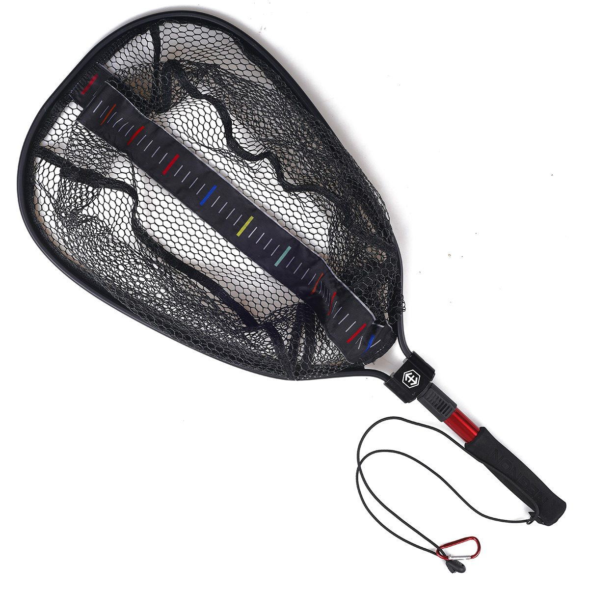 Kształt siatki został tak zaprojektowany aby wkładając do nie rybę, jednocześnie możesz zmieżyć jej długość. Wszyta w podnierak miarka pozwala na bardzo szybkie oszacowanie długości ryby, z dokładnością do 0,5 cm. Kolory powtarzają się co 25 cm, a białe oznaczenia zostału umieszczone co 1 cm.