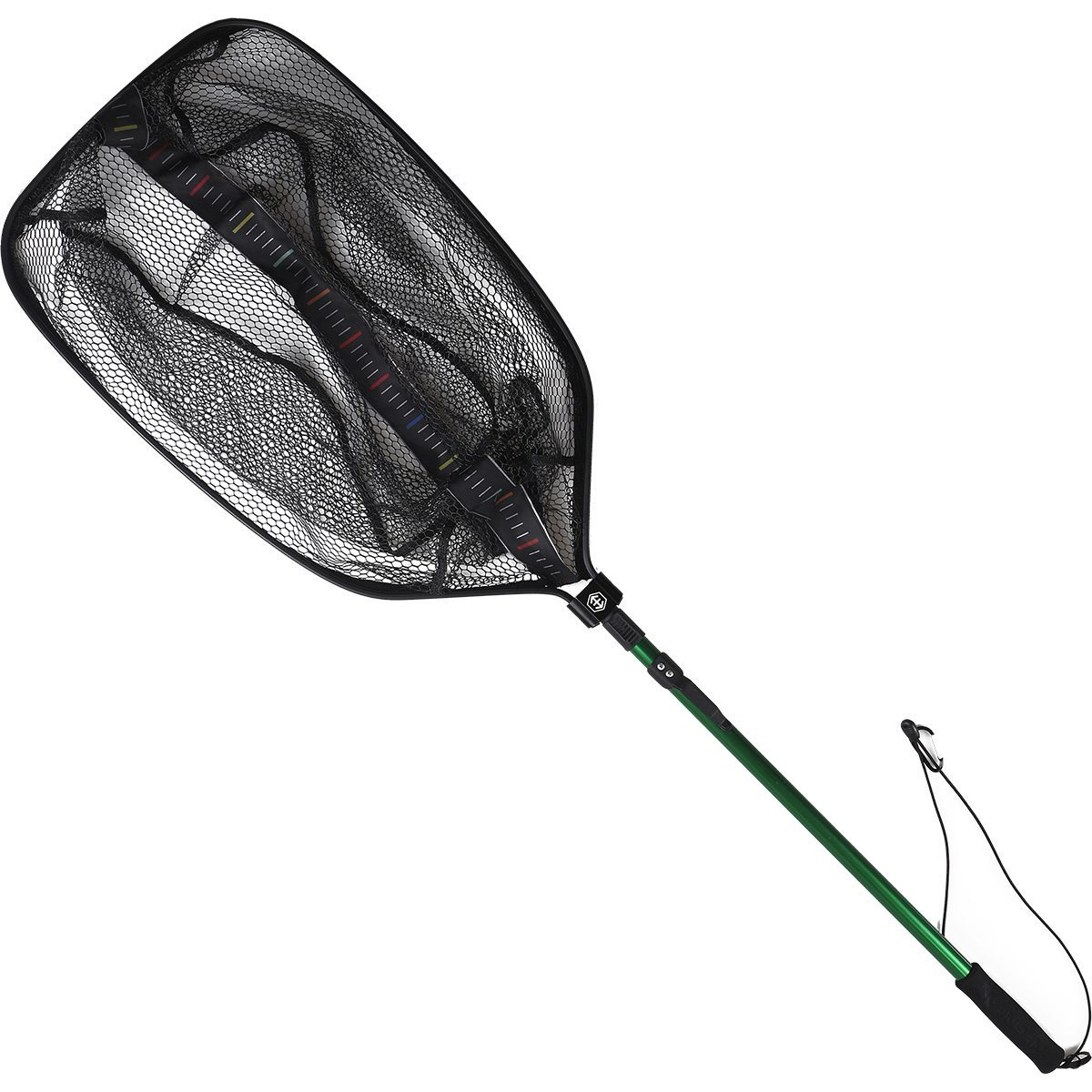 Kształt siatki został tak zaprojektowany aby wkładając do nie rybę, jednocześnie możesz zmieżyć jej długość. Wszyta w podnierak miarka pozwala na bardzo szybkie oszacowanie długości ryby, z dokładnością do 0,5 cm. Kolory powtarzają się co 25 cm, a białe oznaczenia zostału umieszczone co 1 cm.