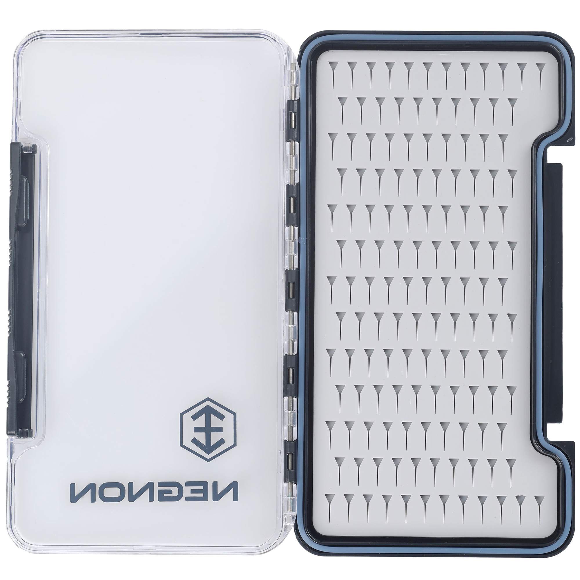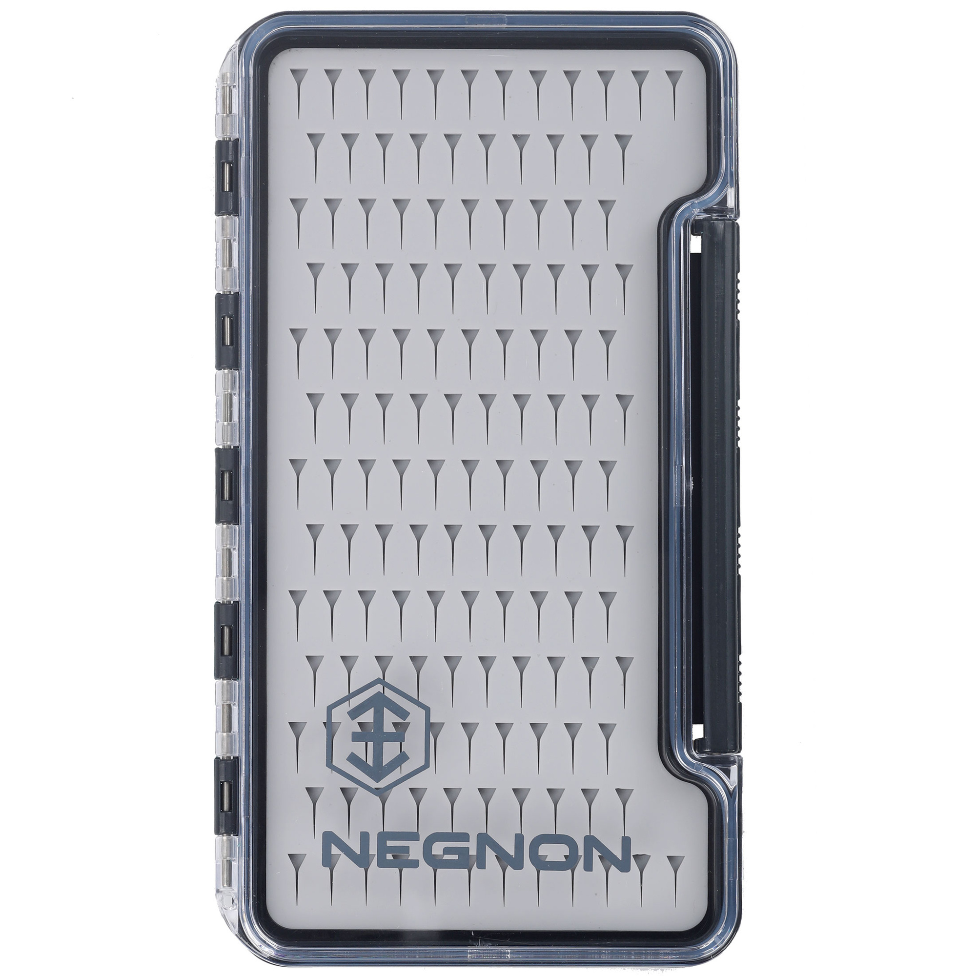 Negnon View Slim SL Fly Box - Large to duże pudełko na nimfy i streamery. Wyposażone w uszczelkę, gwarantuje pełną wodoszczelność po zamknięciu. Przezroczysta obudowa pozwala na szybki wgląd w zawartość, bez konieczności otwierania pudełka. Solidny zawias i pewne zamknięcie zapewniają trwałość i bezpieczeństwo przechowywania. Wewnątrz znajduje się silikonowa wkładka do wpinania much, z wycięciami dostępnymi w różnych wariantach. Wybierz wariant, który najlepiej odpowiada Twoim potrzebom.